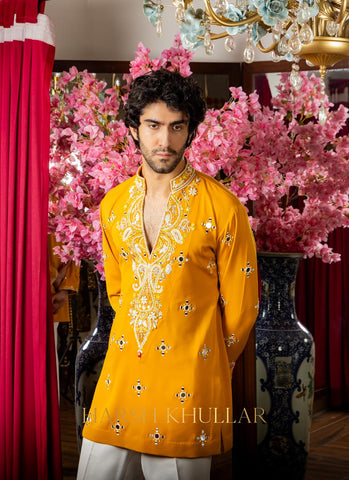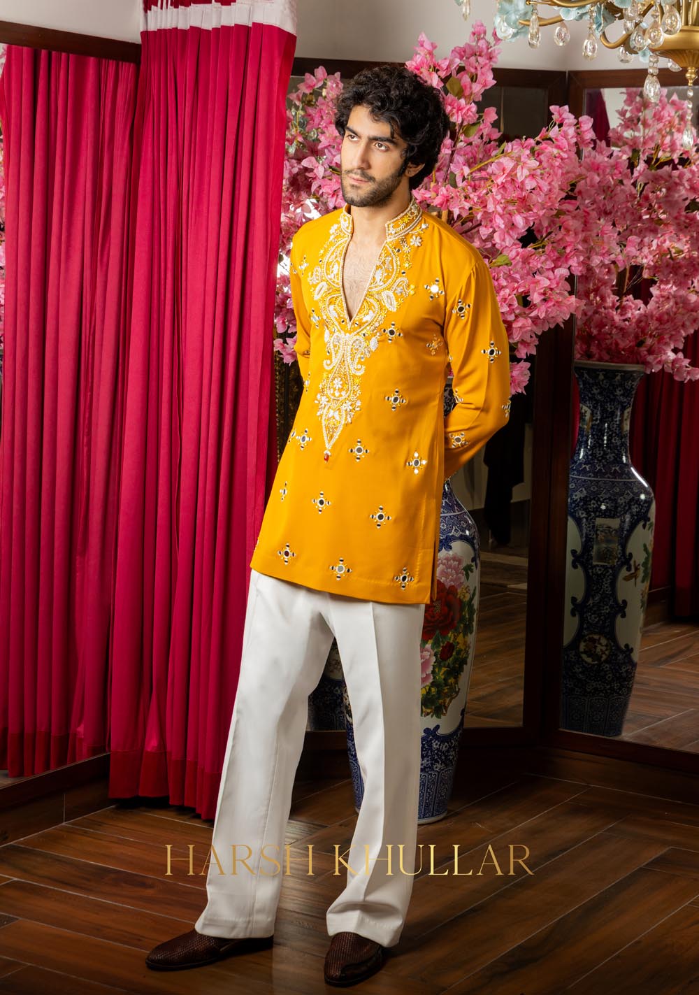 Hand embroidered using our signature pattern in intricate materials .It is paired with well tailored boot cut trousers , making it an ideal choice for elegant celebrations and special occasions.