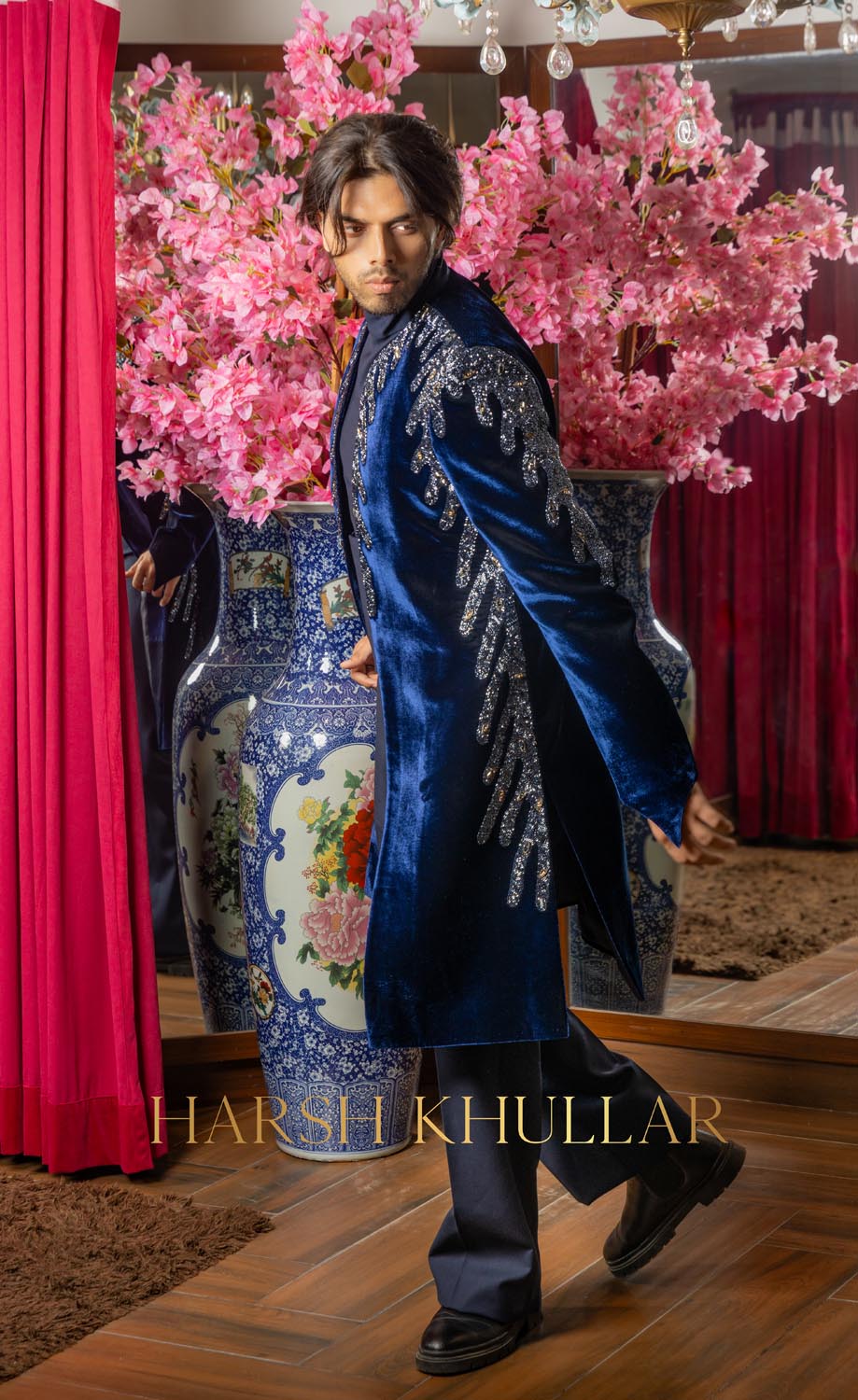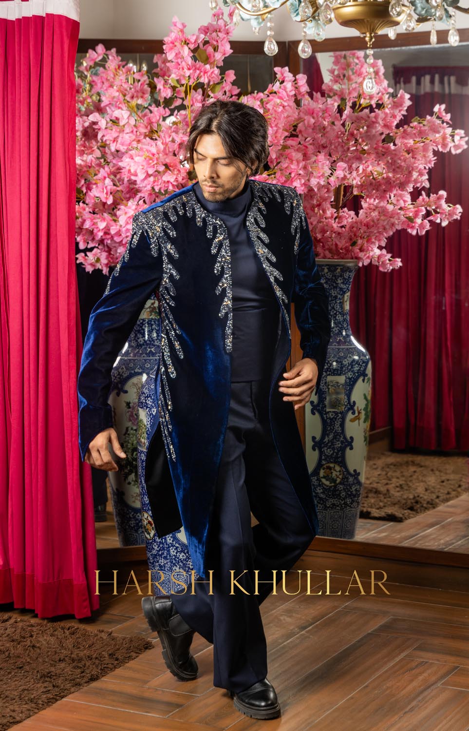 Hand embroidered using our signature Octupus motif in intricate materials .It is paired with a High neck sports look tshirt , well tailored trousers and a custom waistband , making it an ideal choice for elegant celebrations and special occasions.