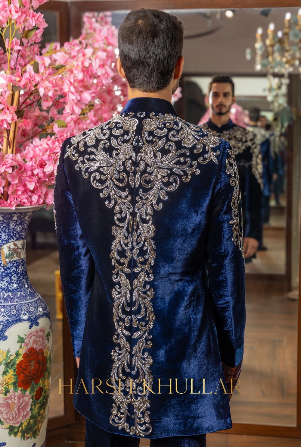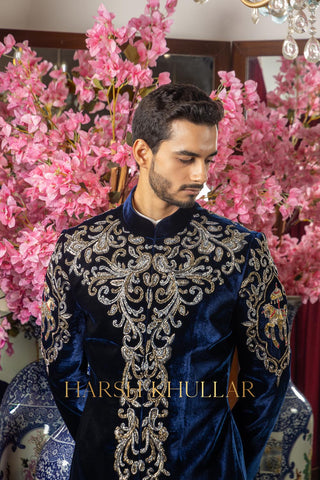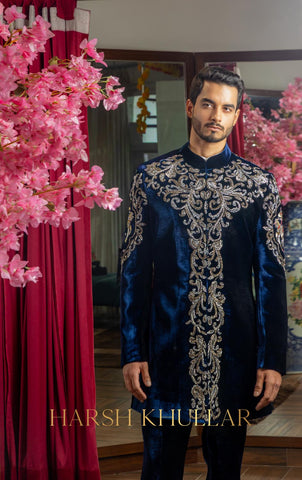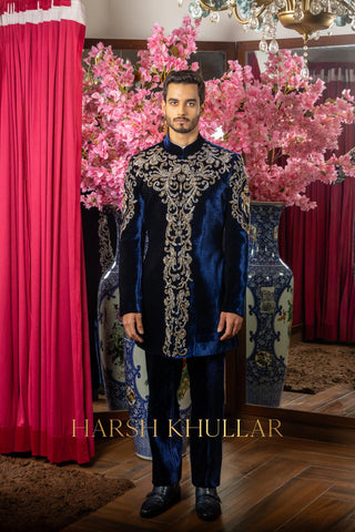 Hand embroidered using our signature horse motif in intricate materials .It is paired with a blue velvet well tailored trousers and a Band Neck Shirt , making it an ideal choice for elegant celebrations and special occasions.