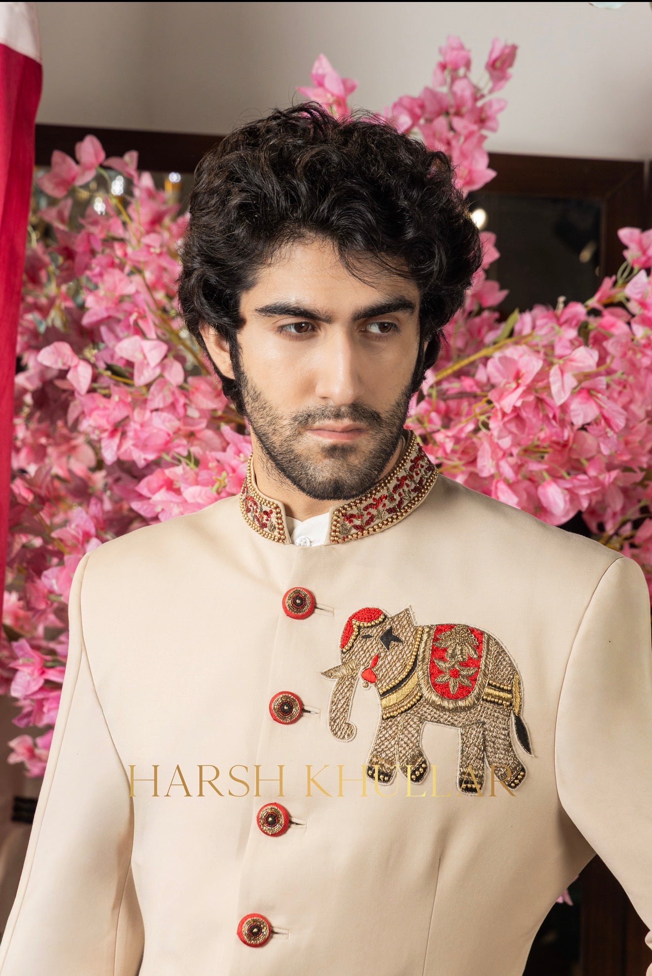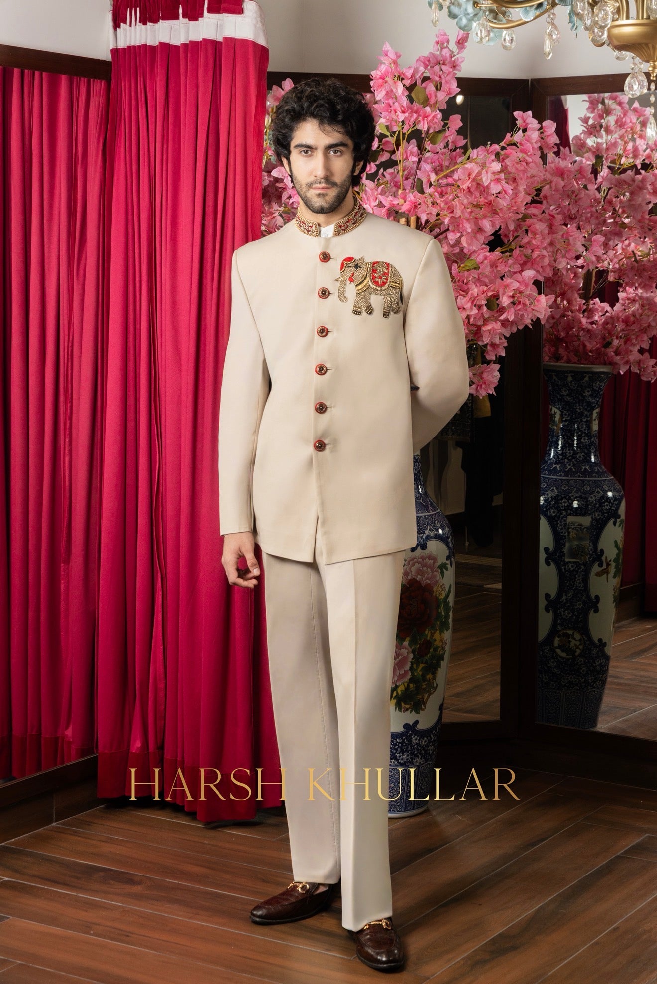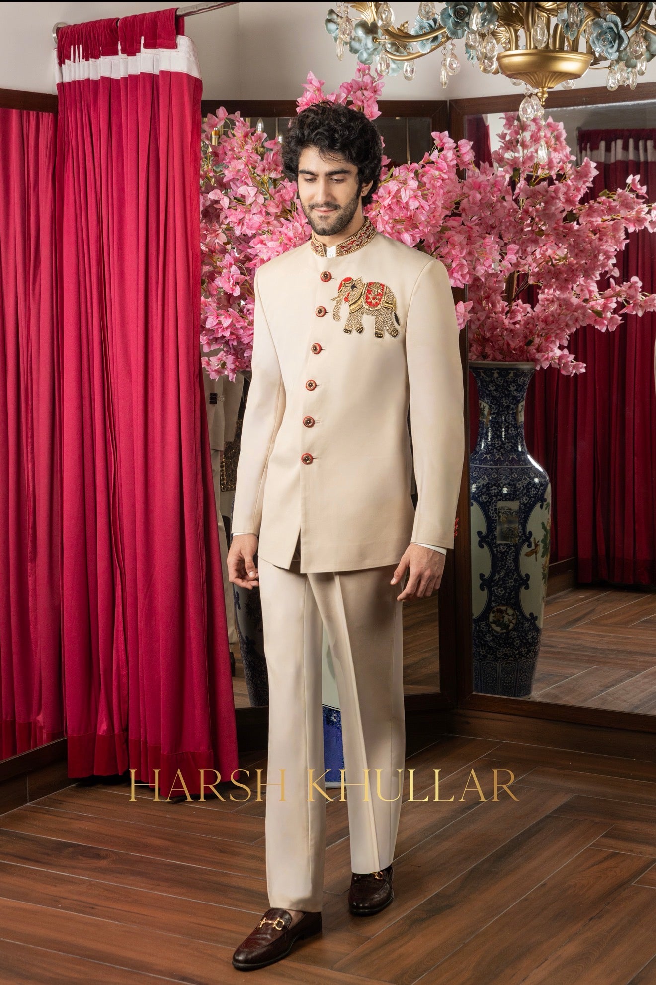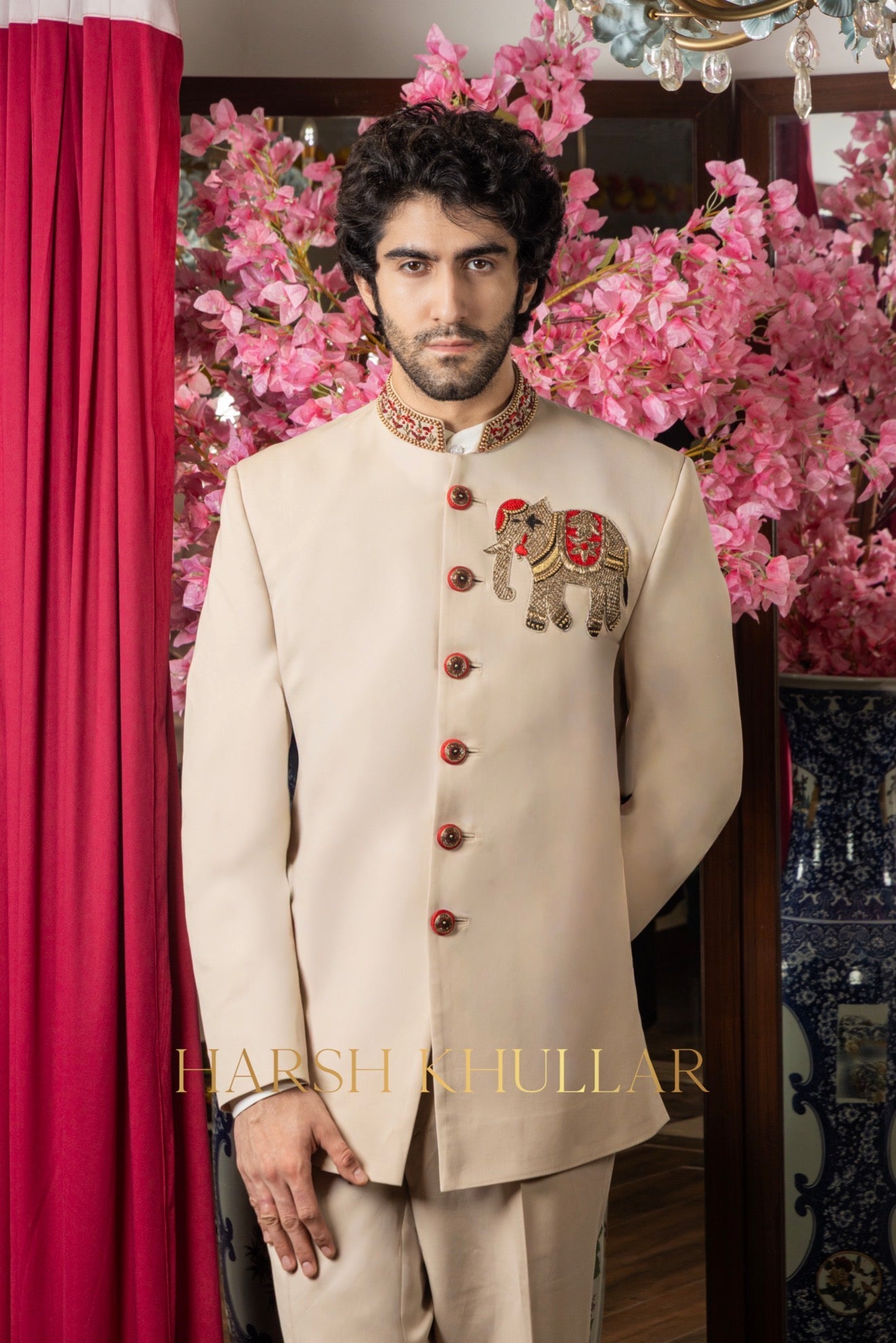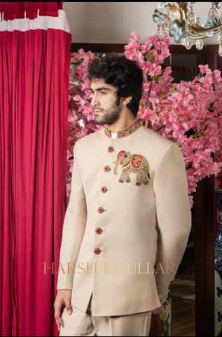 Hand embroidered using our signature Elephant motif in intricate materials .It is paired with a beige well tailored trousers and a Band Neck Shirt , making it an ideal choice for elegant celebrations and special occasions.