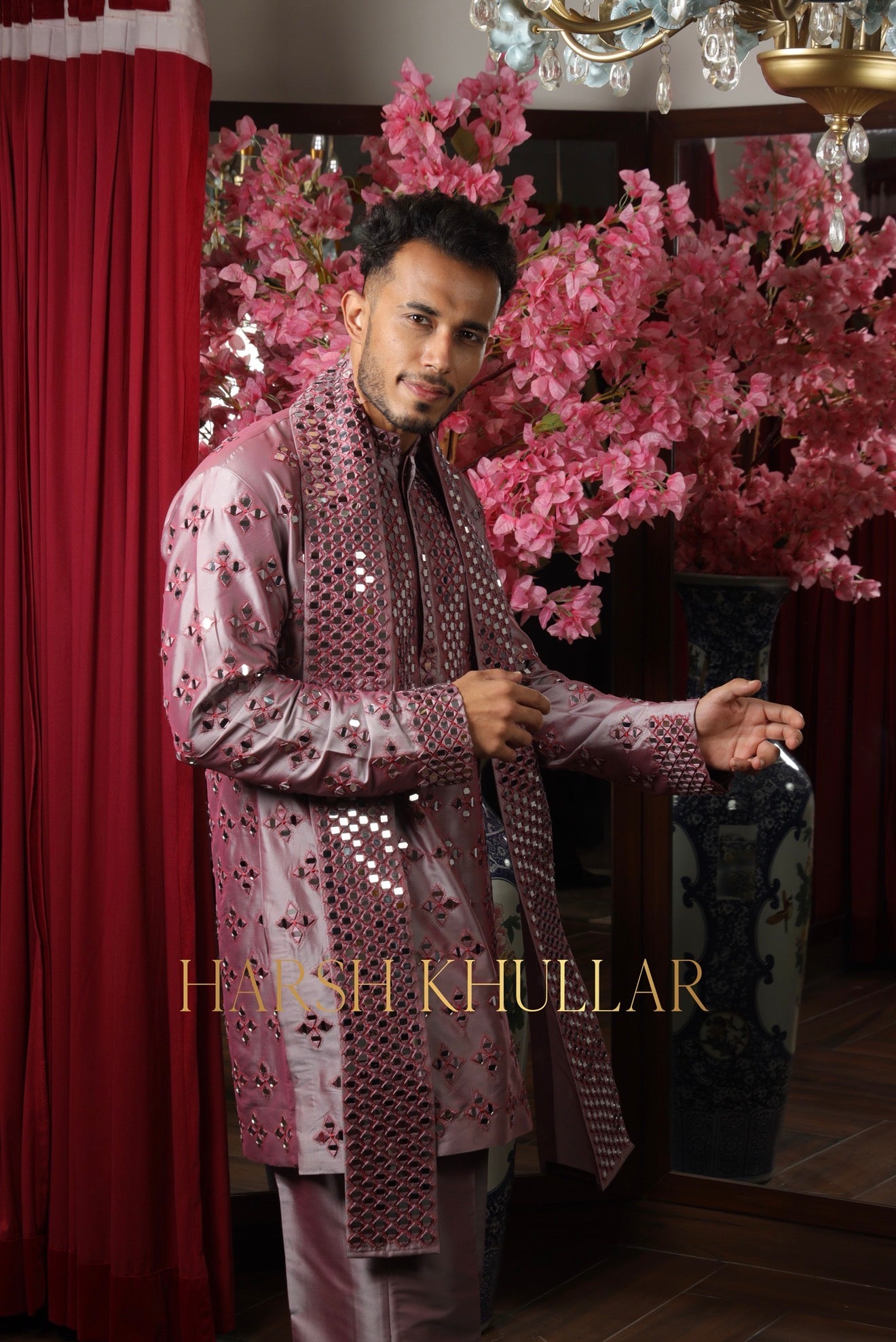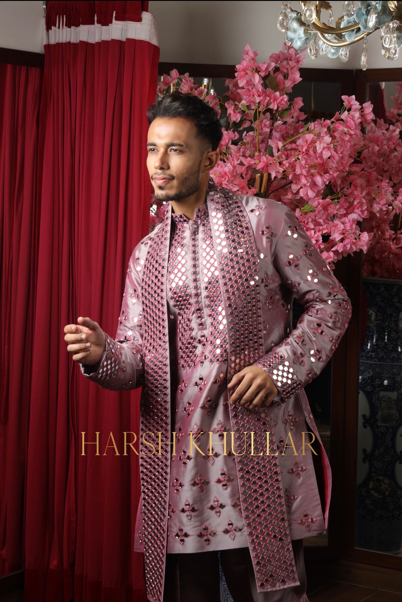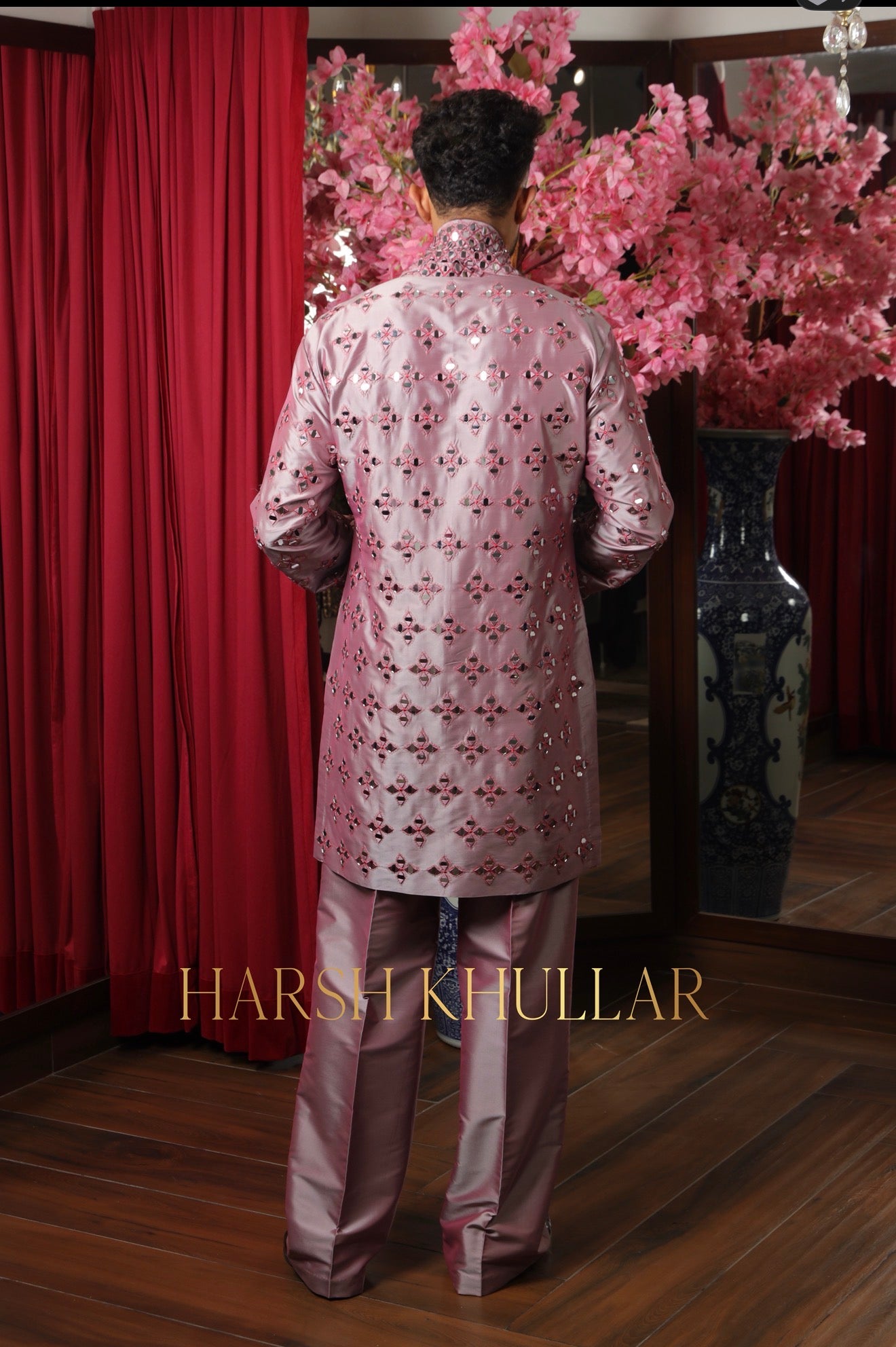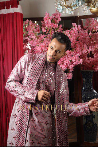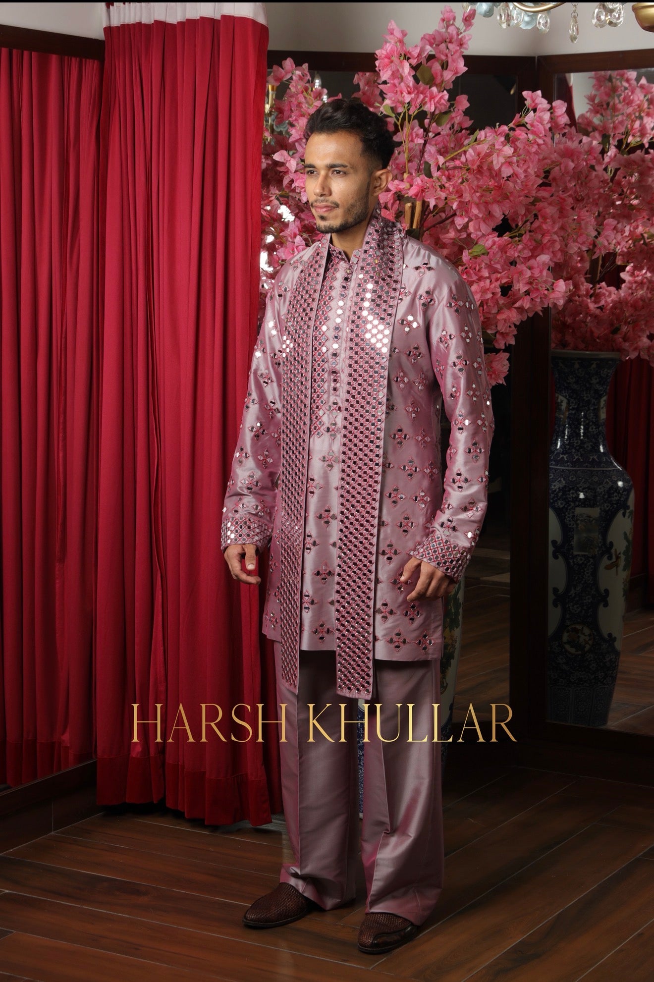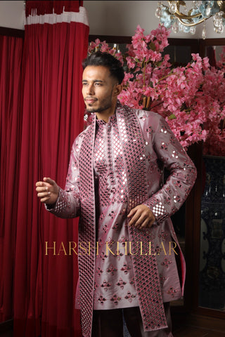 Embroidered using our signature pattern in intricate materials .It is paired with well tailored straight cut trousers and a heavy stole , making it an ideal choice for elegant celebrations and special occasions.